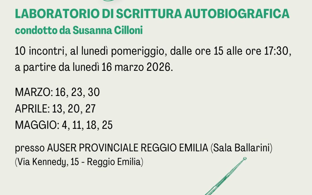 A partire da lunedì 16 marzo, presso la sede provinciale Auser di Reggio Emilia – Sala Ballarini (Via Kennedy n°15), prenderà il via il laboratorio di scrittura autobiografica “La scrittura come conoscenza di sé: le origini”, promosso da Auser in collaborazione con Libera Università dell’Autobiografia di Anghiari.