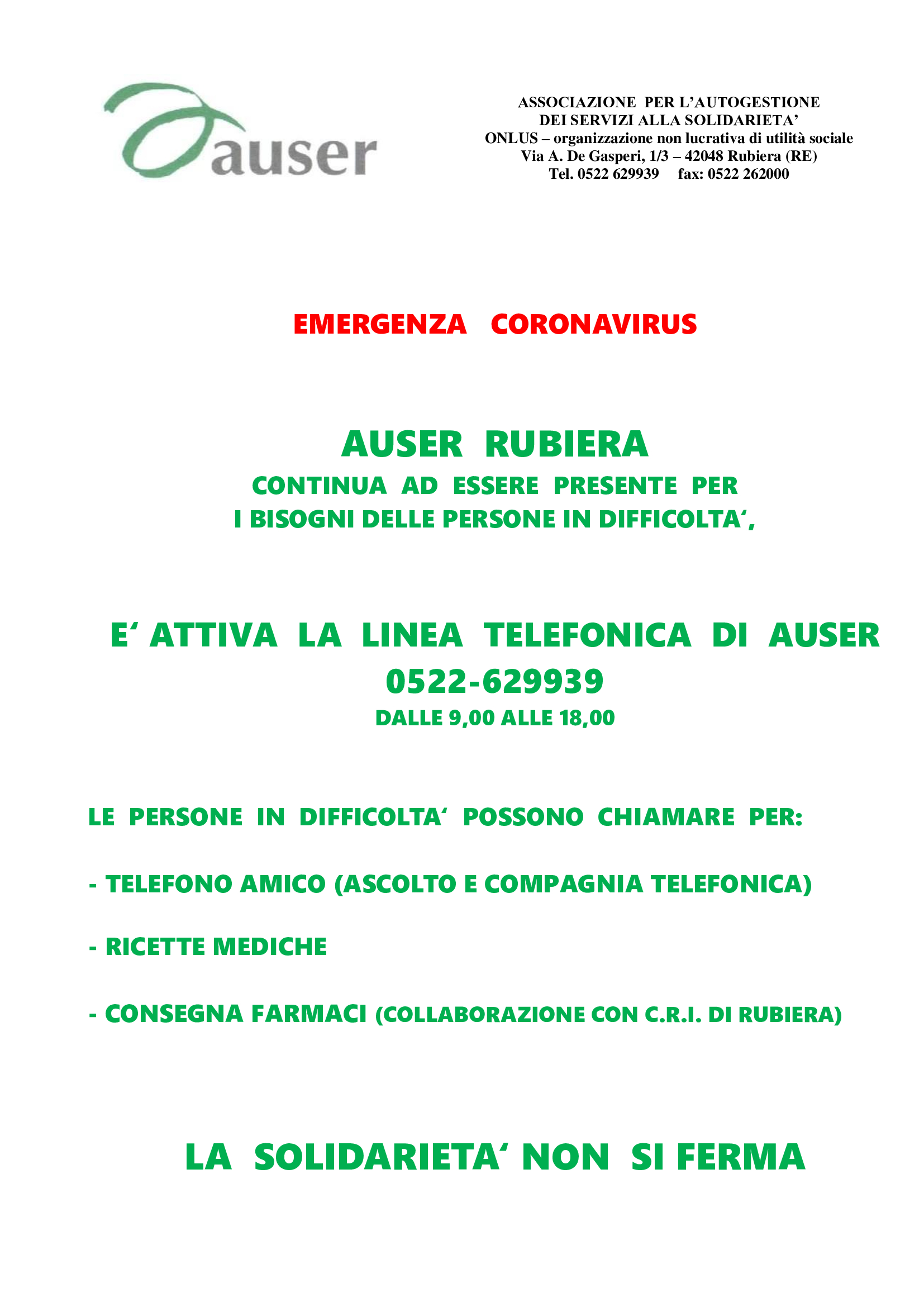 Castelnovo Sotto: Auser fa attività di consegna farmaci/spesa e di compagnia telefonica per anziani soli 366 7316533.